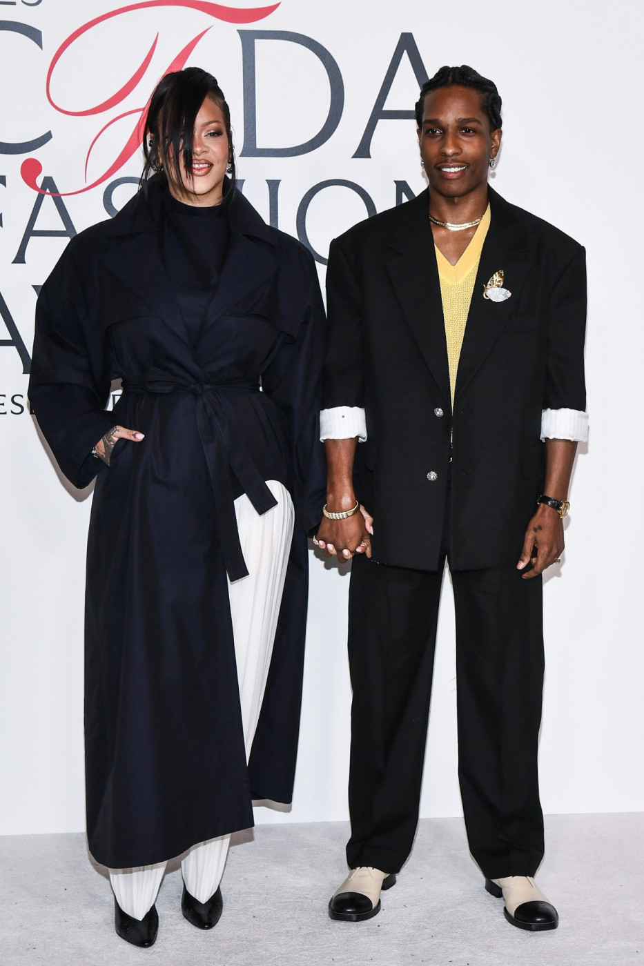 Njena asimetrična tamnoplava jakna na preklop elegantno je prebačena preko topa, dok bele plisirane pantalone dramatično vire iz proreza na jakni i slobodno padaju niz noge, završavajući u špicastim crnim lakiranim salonkama. Ovime je Rijana savršeno spojila klasične muške elemente sa odvažnim, modernim siluetama, stvarajući utisak moći, samopouzdanja i suptilnog retro šika.
