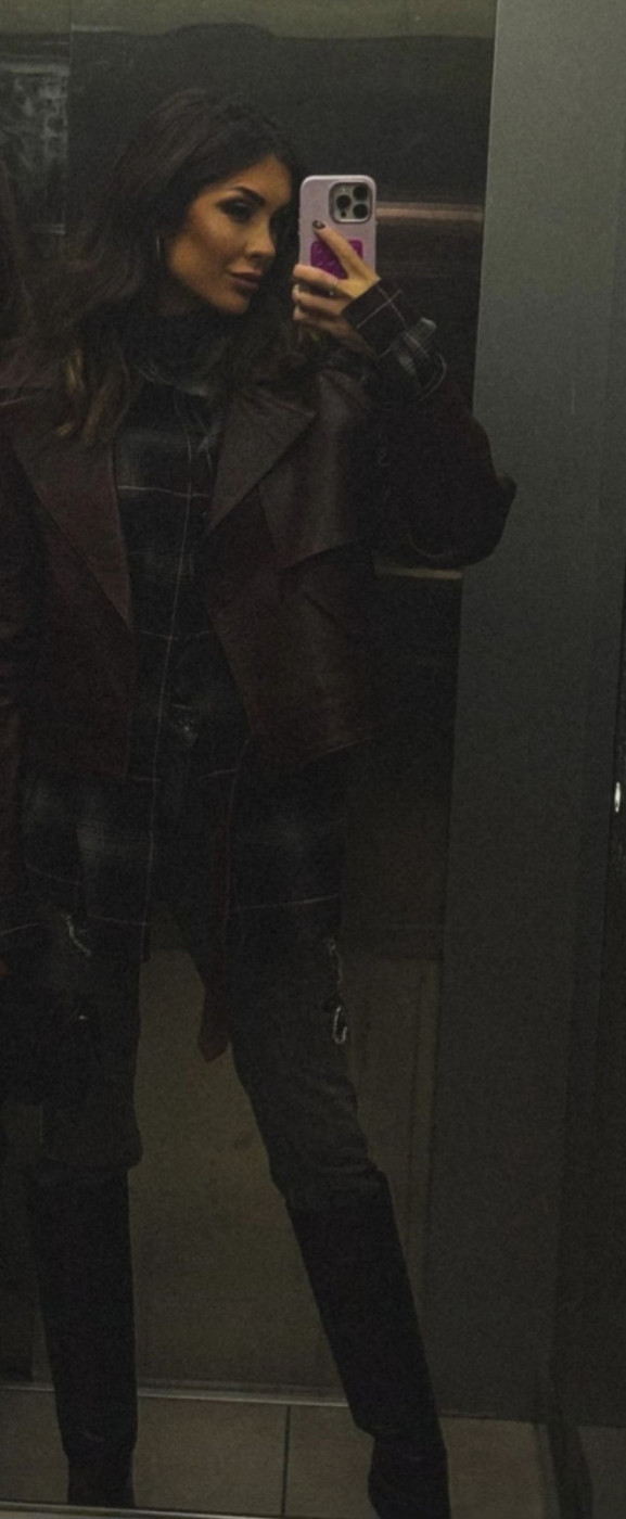 Ispod jakne nosila je kariranu košulju, koja je unela dozu šarma, dok su uske farmerke dodatno naglasile njenu figuru i učinile da cela kombinacija izgleda skladno i proporcijalno. Čizme na potpeticu savršeno su zaokružile autfit, dajući mu moderan, urban i trendi izgled, dok su detalji poput boje i kroja jakne učinili da stajling izgleda luksuzno i promišljeno.