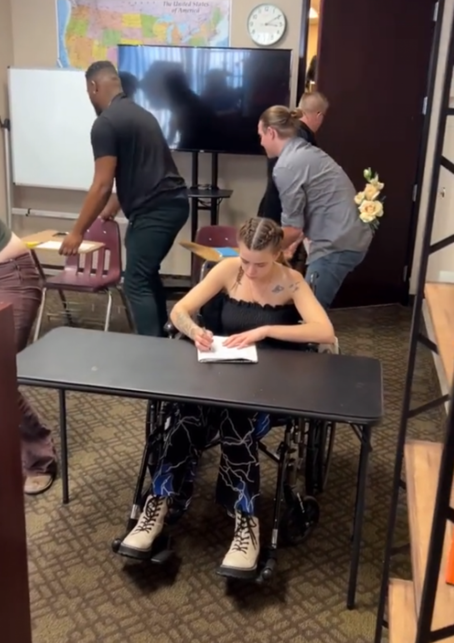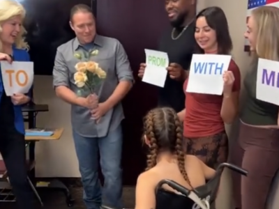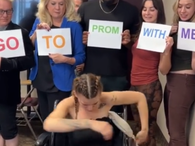 Kad se devojka konačno spakovala i okrenula kolica kako bi krenula kući, ugledala je grupu u kojoj su bili što njeni profesori, što kolege koje drže transparente. Bila je u trenutku zatečena, ali i dalje nije videla ko je to poziva na maturu, budući da se dečko skrivao iza ovih ljudi. Kad je videla ko je u pitanju njeno lice se ozarilo, ali je od šoka jedva uspela da klimne glavom u znak pristanka. Devojka je u neverici rukom prekrivala usta, na ivici suza, ovog puta suza radosnica. Dvoje drugara iz istog odeljenja na kraju su se i zagrlili, a momak je izvezao dalje njena kolica.