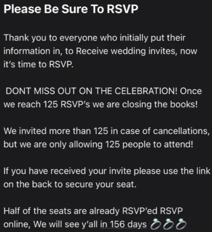 - Upriličićemo venčanje za 125 gostiju. Molimo vas da potvrdite svoje prisustvo. Ne propustite slavlje! Kada dostignemo 125 potvrda, zatvaramo knjigu! Pozvali smo više od 125 ljudi u slučaju otkazivanja, ali dozvoljeno je da samo 125 ljudi prisustvuje slavlju. Ako ste primili pozivnicu, molimo vas da koristite link na poleđini kako biste obezbedili svoje mesto na vreme - pisalo je od strane mladenaca, a o tome je pisao San.