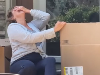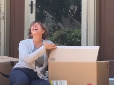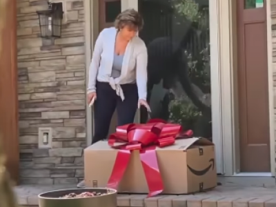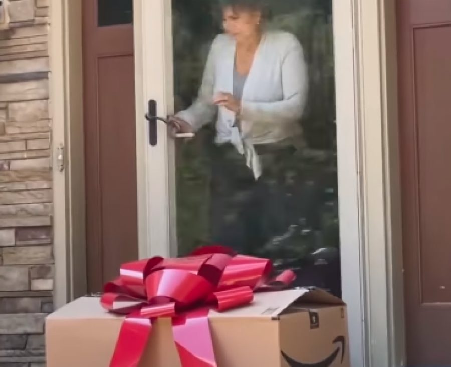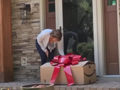 Ćerka nosi ogromnu kartonsku kutiju koja preko ima veliku dekorativnu crvenu ukrasnu mašnu. Ona ostavlja kutiju na pragu svoje mame i zvoni na vrata, a potom žuri kako bi se sakrila iza obližnjeg žbunja, ali ujedno i usnimila sve.