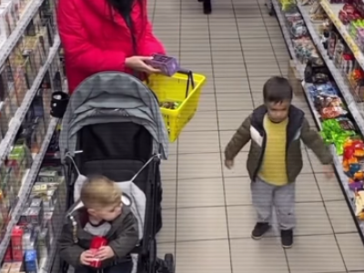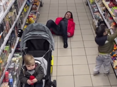 Stariji dečak je uzeo kesicu bombona i pokazao je mami, međutim, na njegovo razočarenje ona je odmahnula glavom, stavivši mu do znanja da ih neće kupiti. Istog trenutka usledila je nezamisliva scena: dete je bacilo kesicu bombona na pod, a potom leglo u svesnoj nameri da histeriše. Iako na snimku nema tona, vidi se kako dete besno udara nogama o pod.