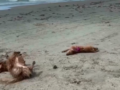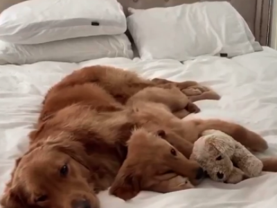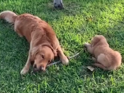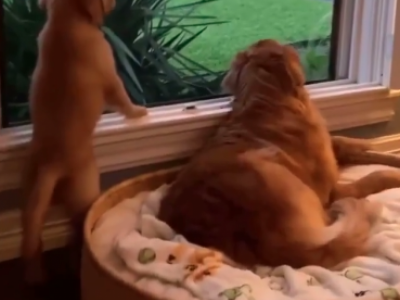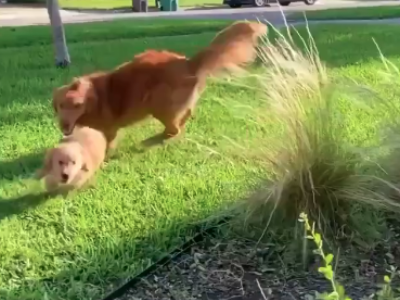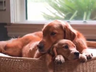 Zlatni retriver odmah prilazi korpi i kreće sa nestrpljenjem da je njuška. Izgleda da je on u startu prihvatio novog psića, a njihov snimak topi i najtvrđa srca.
