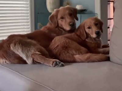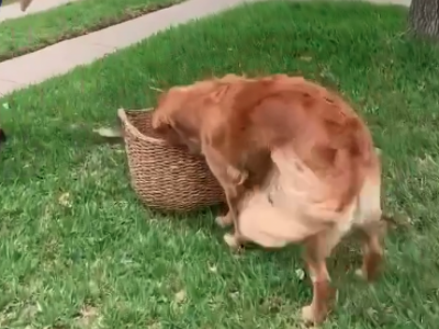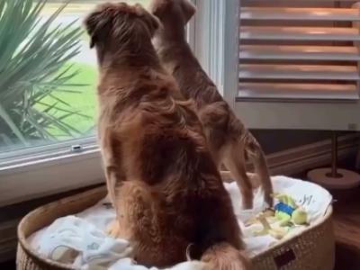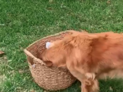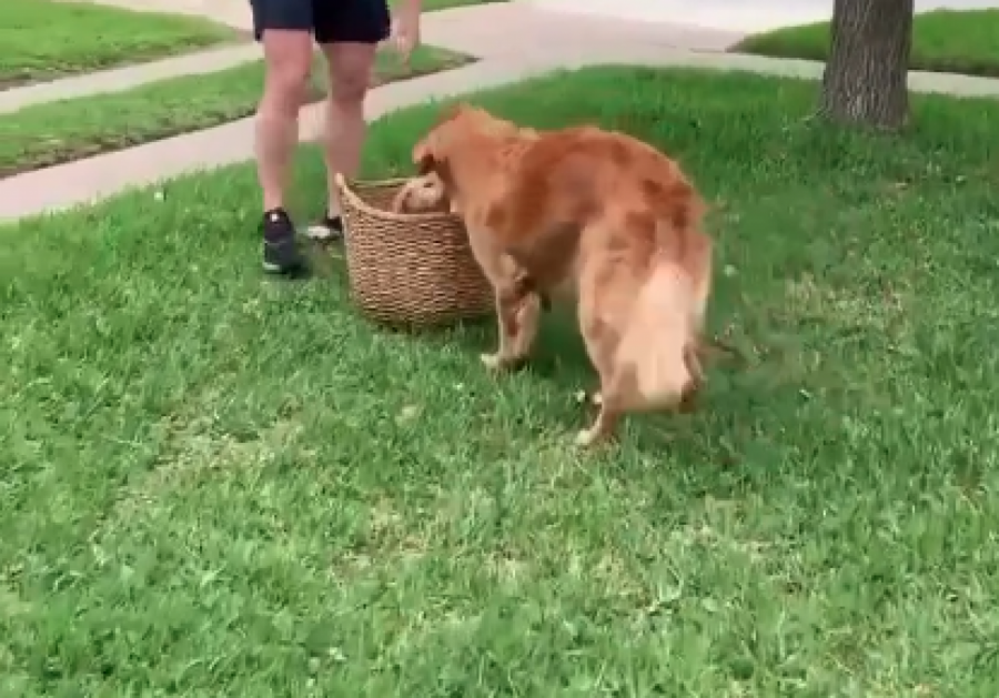 Snimak koji je postao viralan na društvenim mrežama prikazuje zlatnog retrivera i njegovu reakciju na štene. Vlasnik je u dvorište doneo veliku otvorenu korpu iz koje izviruje glava šteta. On korpu spušta na travnjak ispred kuće i posmatra oprezno kako će njegov ljubimac reagovati na novog psa, spreman da se umeša ako to zatreba.