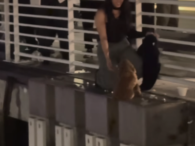 Devojka je pokazala neverovatnu hrabrost kada je preskočila ogradu sa mosta kako bi spasila malenog psa koji je bio u opasnosti da padne. Dok ju je dečko sa sigurne strane mosta pridržavao, ona je brzom reakcijom uspela da uhvati psića i vrati ga na sigurnu stranu mosta.