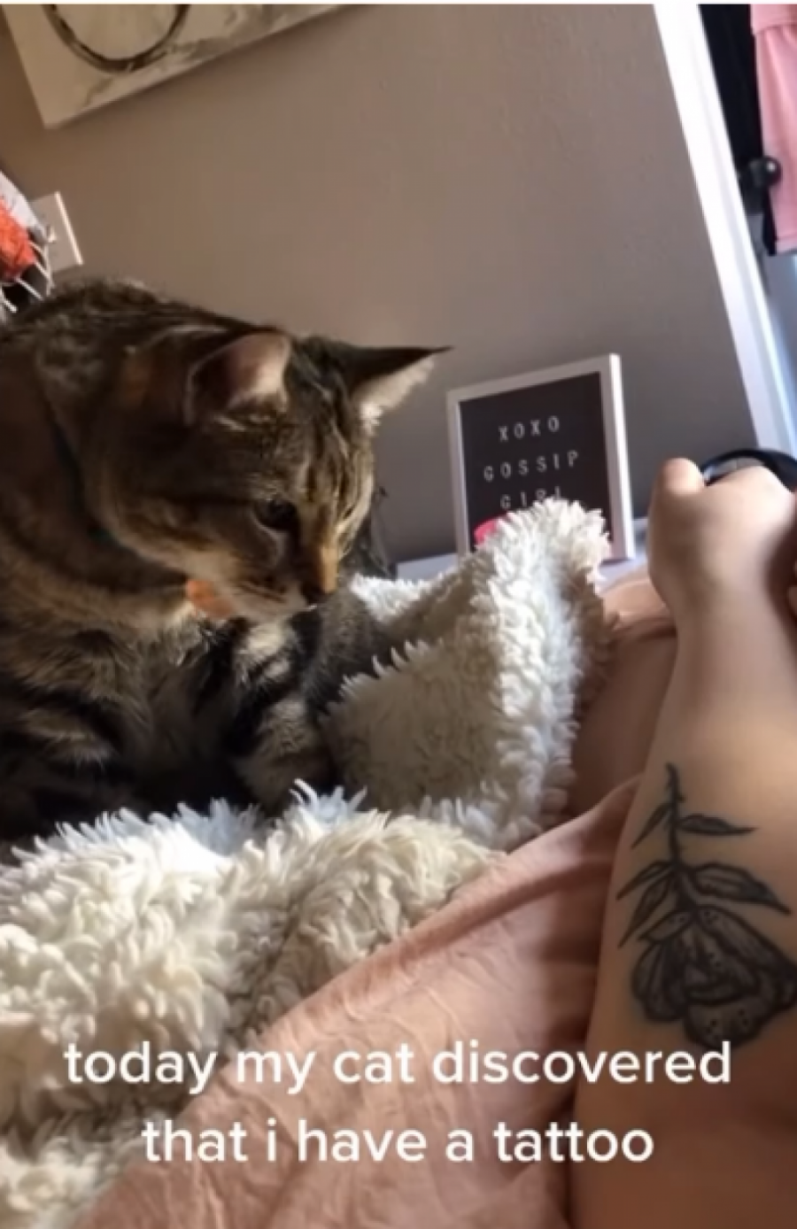 Mačke su po prirodi radoznale životinje, pa će mnoge od njih verovatno biti zainteresovane za bilo kakve promene na telu vlasnika. Tetovaže, kao vizuelna promena, mogu izazvati radoznalost kod mačaka koje će istraživati i dodirivati tetovirano područje. Upravo tako je reagovala mačka sa snimka koji je upravo zbog ovog kućnog ljubimca postao rado gledan.