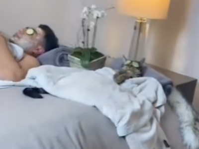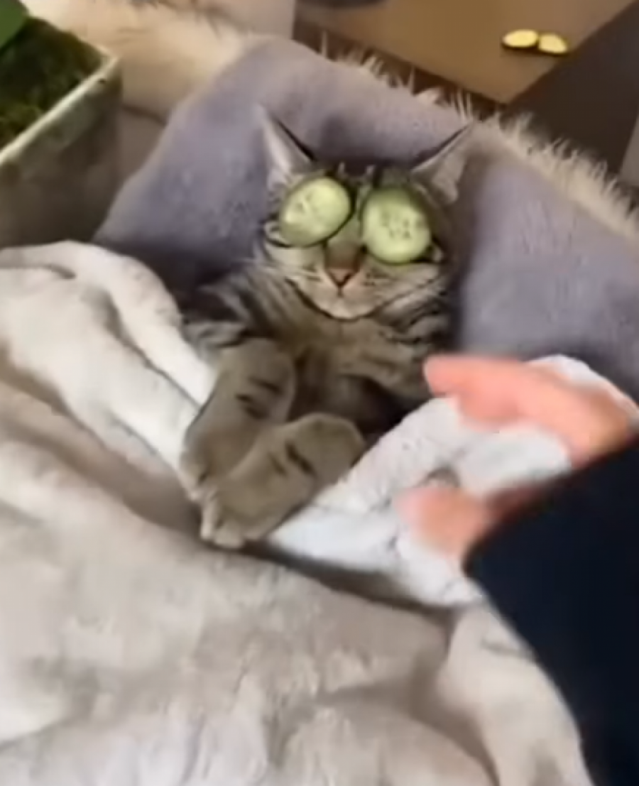 Žena je ušla u spavaću sobu i zapanjila se kad je ugledala nesvakidašnju scenu. Njen suprug je rešio da sebi napravi “spa dan” u kome će maksimalno uživati. On je pustio relaksirajuću muziku, dok je ležao na krevetu kao posle masaže. Na licu je masku za negu, a tu su i dva neizbežna koluta krastavca kojima je pokrio oči. Međutim, ono to je bilo neobično je njihova mačka koja je ležala do njega u identičnom izdanju.