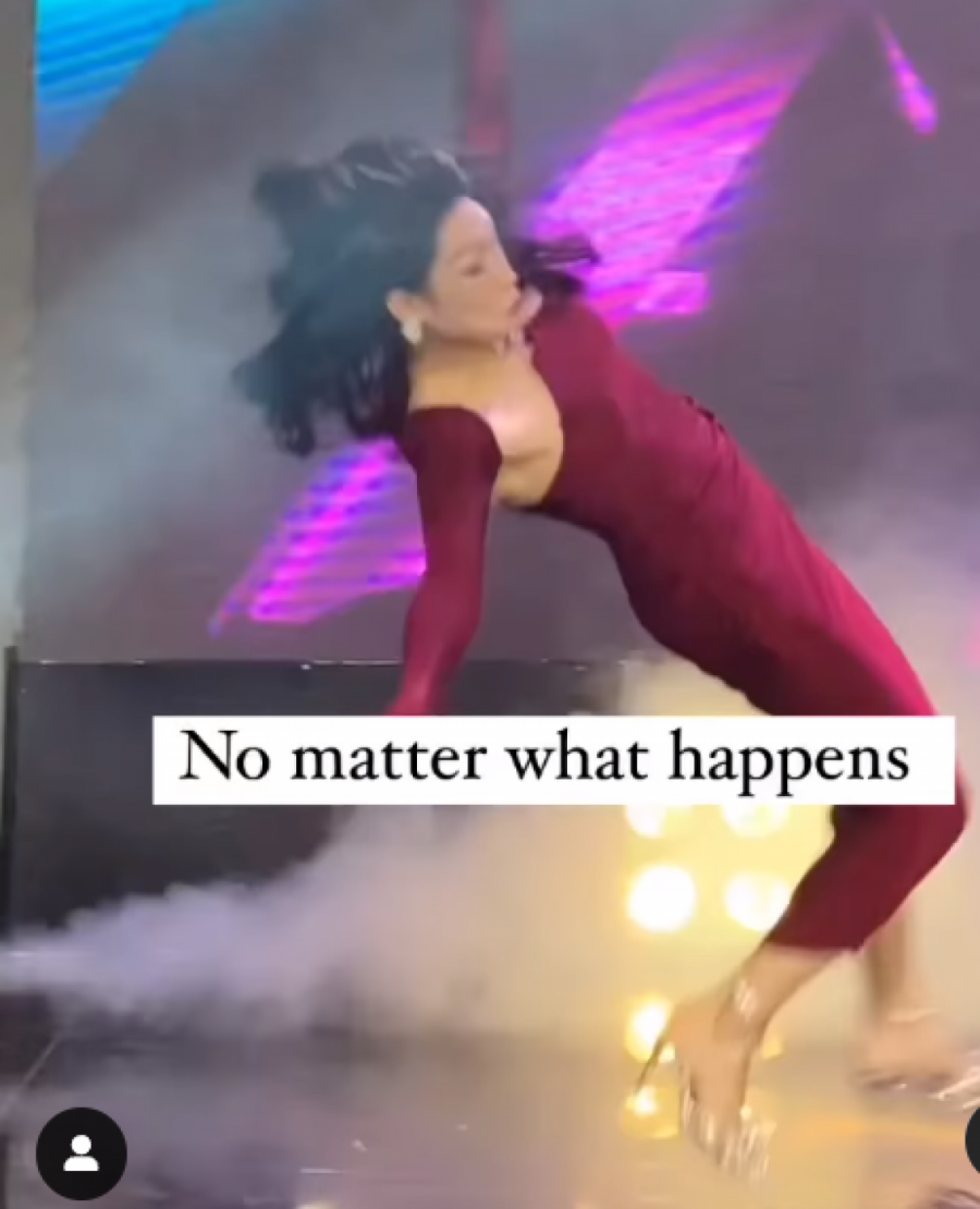 Snimak koji je osvanuo na društvenim mrežama i koji je pregledan više stotina hiljada puta je onaj na kome je lepotica na izboru za neku prestižnu titulu. Zgodna crna kročila je na pistu u uskoj top haljini bordo boje koja doseže do ispod kolena. U kombinaciji sa kreacijom imala je i duge rukavice iste nijanse bordo boje, koje su ujedno predstavljale i neku vrstu bolera. Duga crna kosa padala joj je preko ramena, dok je celokupan stajling zaokružila srebrnim sandaletama visokih potpetica. Izgleda da obuća nije bila najudobnija ili je pista bila previše klizava, što se često dešava i prilikom modnih revija - tek, usledio je iznenadni pad.