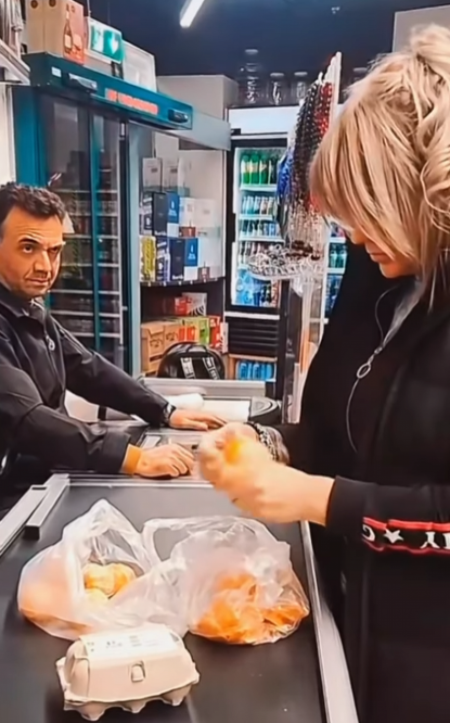 Prodavac je vidno negodujući izmerio ženi mandarine bez kora, ali na tome se nije zaustavio. Žena je u korpi imala i pakovanje jaja. Budući da je svaku mandarinu oljuštila, kasir je rešio da pođe njenim rpimerom, pa je uzeo salvetu i počeo za kasom da razbija jaja, jedno za drugim. Žena je u trenutku pomislila da je u pitanju neka šala, pa se nasmejala kad je kasir razbio prvo jaje, ali kad je razbio i drugo jaje iz karotnskog pakovanja već joj nije bilo do smeha.