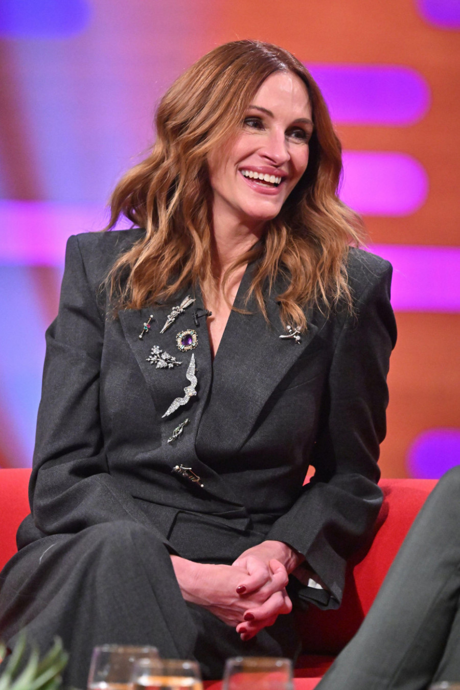 U pitanju su elegantna odela u vidu zvonastih pantalona i strukiranog sakoa, užeg modela i to najčešće u sivoj boji. Nedavno je ponela upravo takav autfit, sako je bio zakopčan, a po njegovom reveru bio je čitav red broševa.