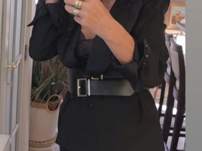 U gornjem delu ponela je crnu veš-majicu, preko koje je išao strukirani crni sako, dužeg modela. Primetan je bio crni manikir, perfektna frizura i neizostavne naočare za sunce. Sa kožnim kaišem oko struka koji je isticao njenu vitku liniju, samouvereno je pozirala ispred ogledala.
