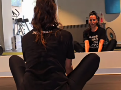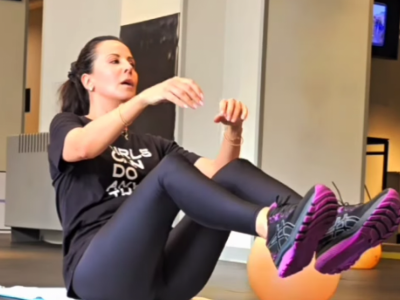 Uz crnu majicu je ponela i crne helanke i patike, dok je dugu crnu kosu vezala u visok rep. Primetno je da je radila vežbe slične onima na aerobiku, koje su očigledno bile u službi zagrevanja, da bi potom prešla na pilates vežbe koje je radila uz čuvenu pilates loptu.